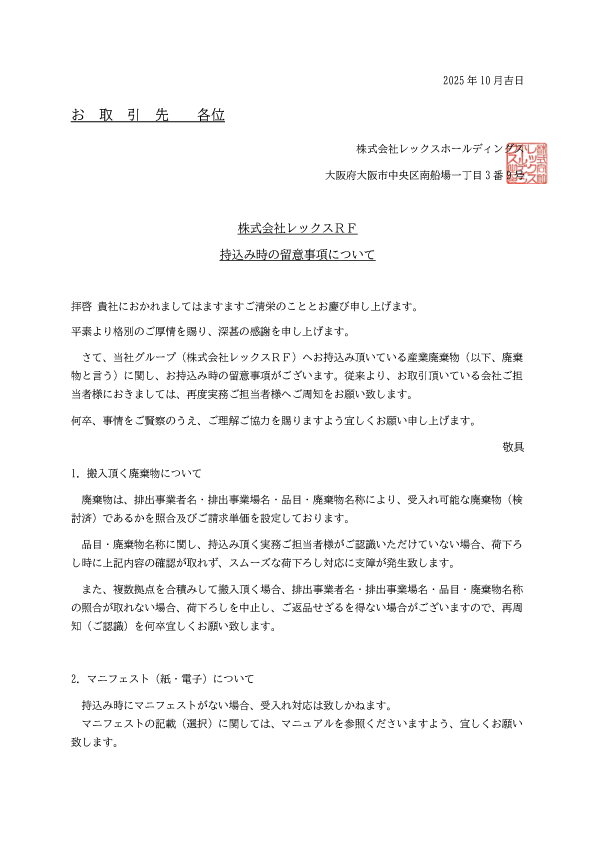 株式会社レックスRFへ産業廃棄物をお持込みいただく際の留意事項について、改めてご案内申し上げます。