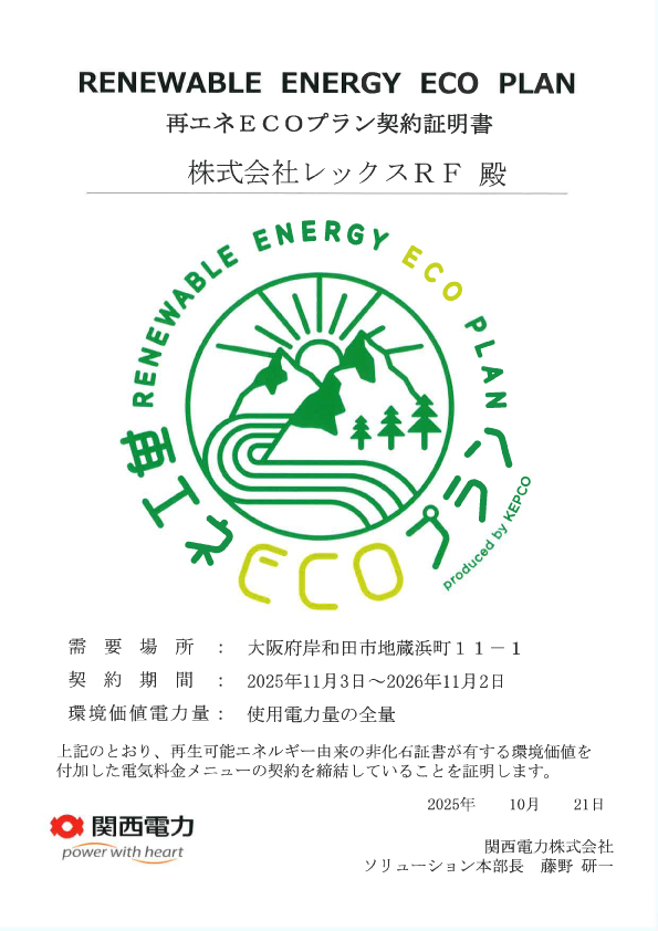 まずは工場で使用する高圧電力について、11月3日より関西電力株式会社の「再エネECOプラン」への切り替えを実施いたします。